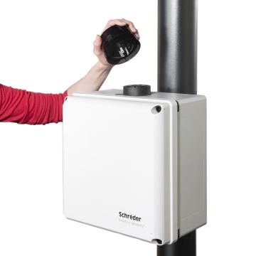 La solución de control para iluminación deportiva Schréder ITERRA ocupa un espacio mínimo y ofrece una flexibilidad excelente para la instalación en el campo. Un armario (ITERRA BASICBOX) funciona como concentrador de conexión y agrupa el cableado del bus de control cerca de los proyectores. Su casquillo NEMA contiene un nodo de control (NODO NEMA ITERRA) que convierte una señal por cable en comunicación inalámbrica por BLE en una red de retícula. Este conjunto puede controlar hasta 8 drivers DALI de forma separada.
