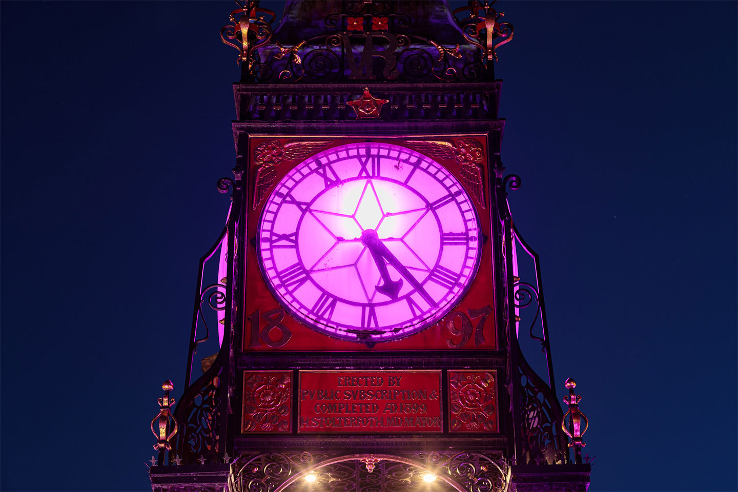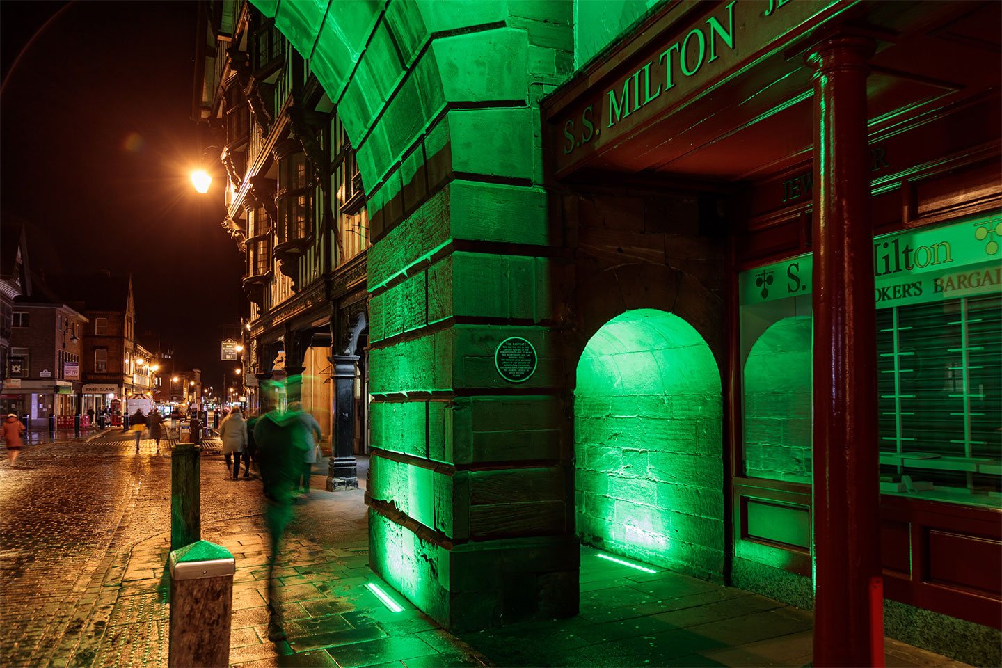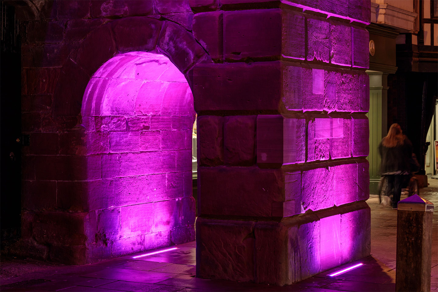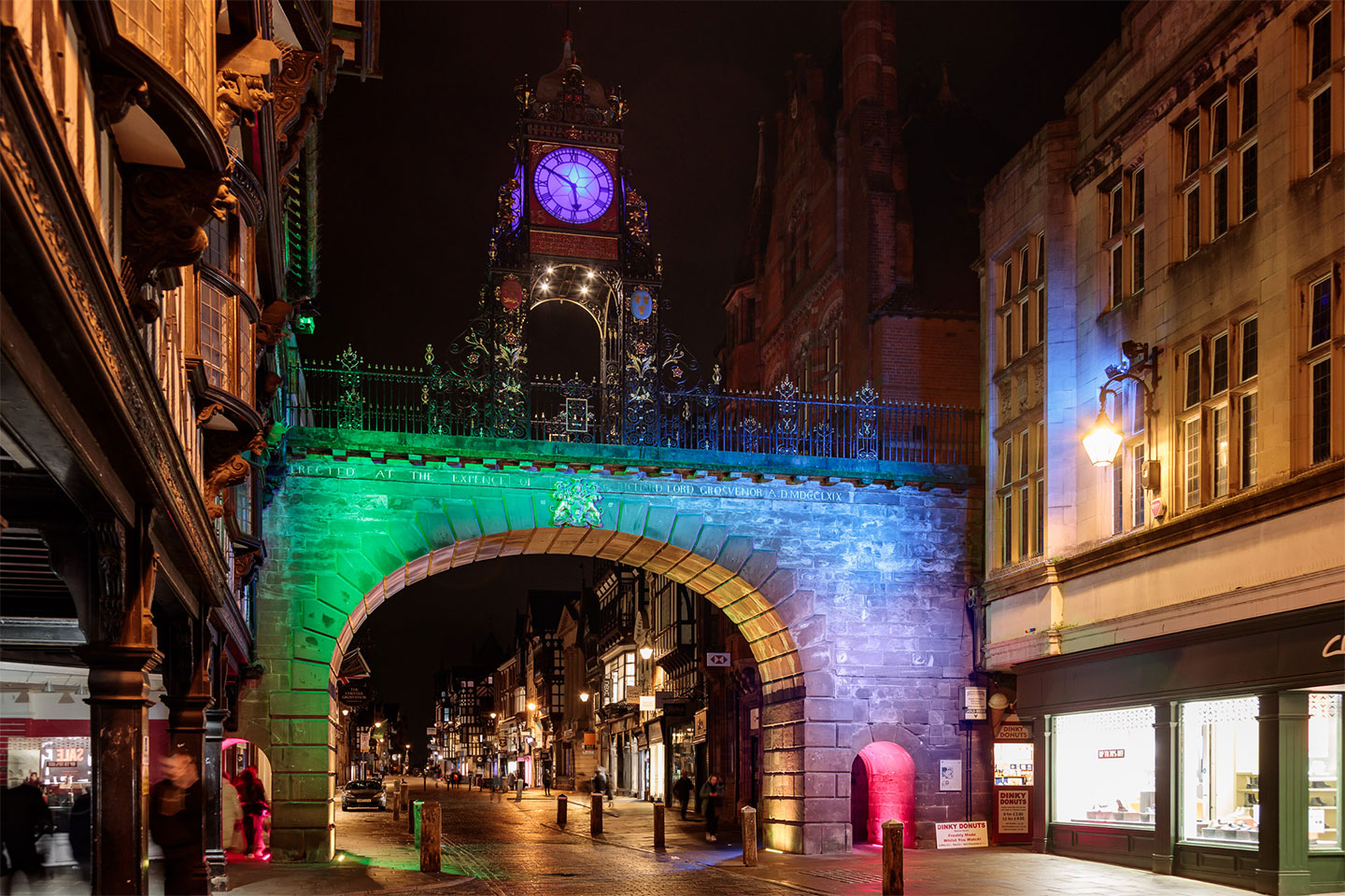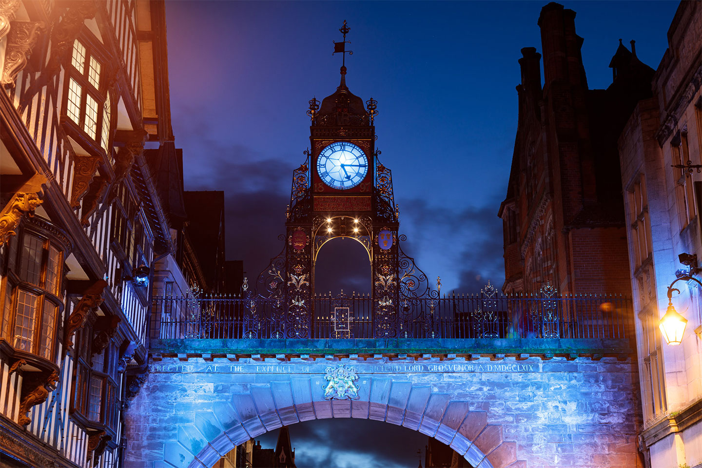 Como parte del plan del municipio de Cheshire West and Chester de crear una comunidad más ecológica, ecuánime y sólida, se decidió iluminar este lugar histórico para generar un espacio público más dinámico. A finales de marzo de 2020, se pusieron en contacto con nosotros para configurar y reprogramar la iluminación del puente Newgate, en Chester. Gracias al éxito de este proyecto, a las soluciones que ofrecimos y tras algunas discusiones internas, el ayuntamiento nos confió la iluminación del reloj de Eastgate. Se nos encomendó la tarea de asesores de diseño, proveedores de control y proveedores de soluciones.