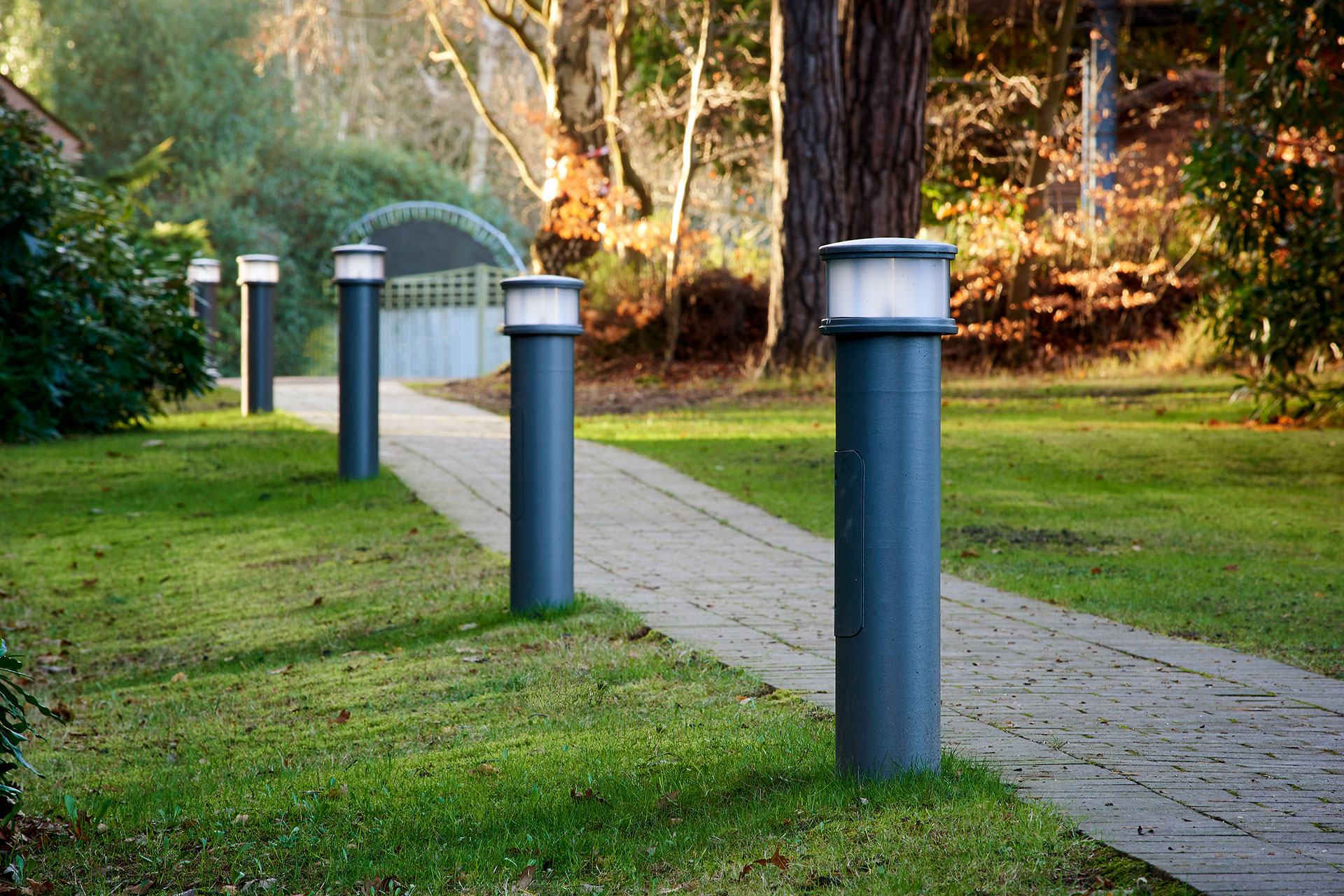 Diez bolardos Pharos también se han instalado para iluminar zonas peatonales. Los LEDs están ubicados en el centro y ofrecen una luz blanca muy clara alrededor de todo el bolardo, proporcionando a los estudiantes y al personal vías seguras y bien iluminadas. Las luminarias son IP 66 LEDSafe Además, proporcionando seguridad a los equipos.